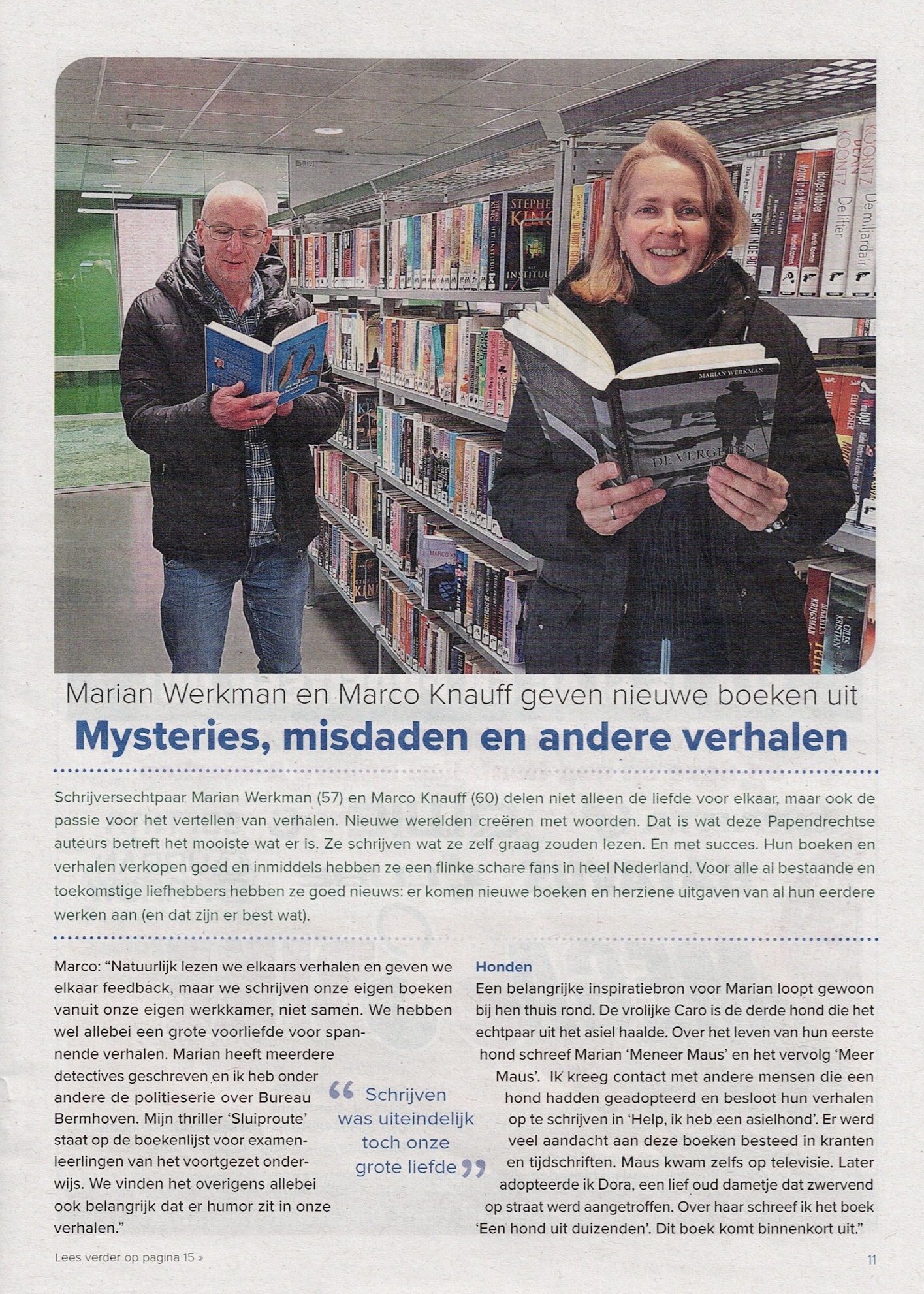 Marco: “Natuurlijk lezen we elkaars verhalen en geven we elkaar feedback, maar we schrijven onze eigen boeken vanuit onze eigen werkkamer, niet samen. We hebben wel allebei een grote voorliefde voor spannende verhalen. Marian heeft meerdere detectives geschreven en ik heb onder andere de politieserie over Bureau Bermhoven. Mijn thriller ‘Sluiproute’ staat op de boekenlijst voor examenleerlingen van het voortgezet onderwijs. We vinden het overigens allebei ook belangrijk dat er humor zit in onze verhalen.”